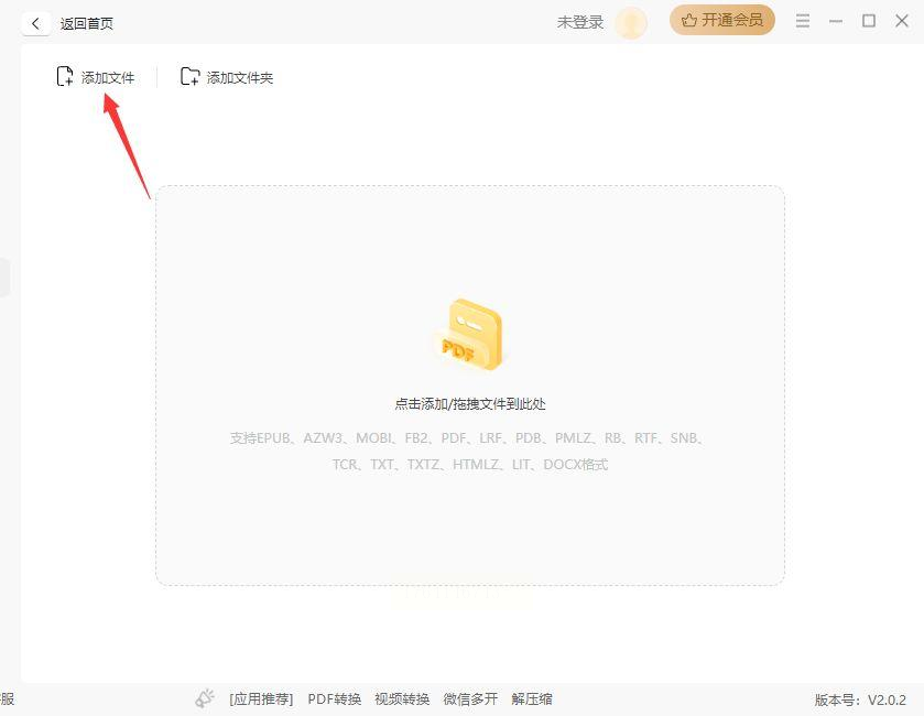 - 单文件导入:点击界面中央的“添加文件”按钮,在弹出的文件浏览器中选中需转换的EPUB文件(可按Ctrl键多选单个文件)。