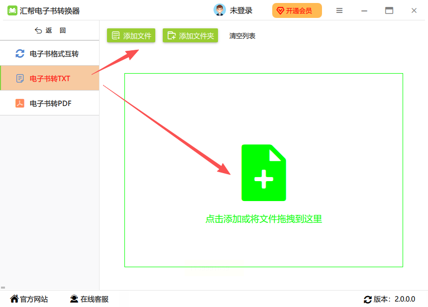 步骤二:在左侧菜单中点击“电子书转TXT”,右侧区域会显示上传按钮,点击上传你的EPUB文件,可以一次添加多个文件。