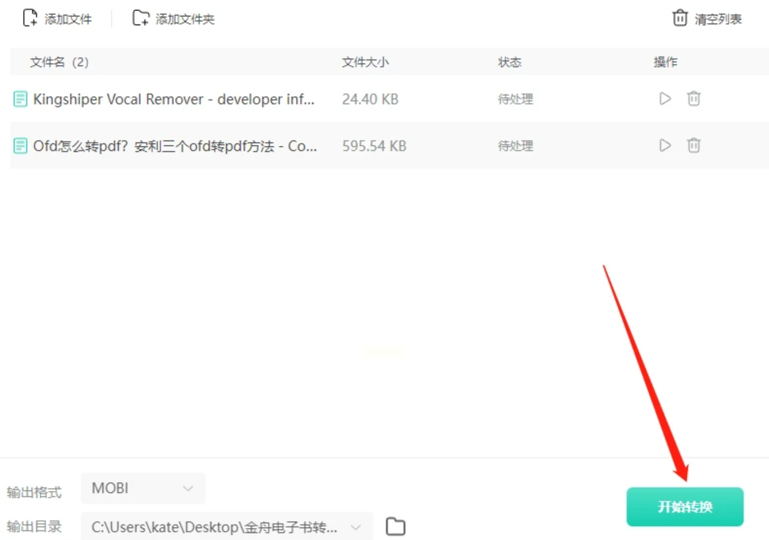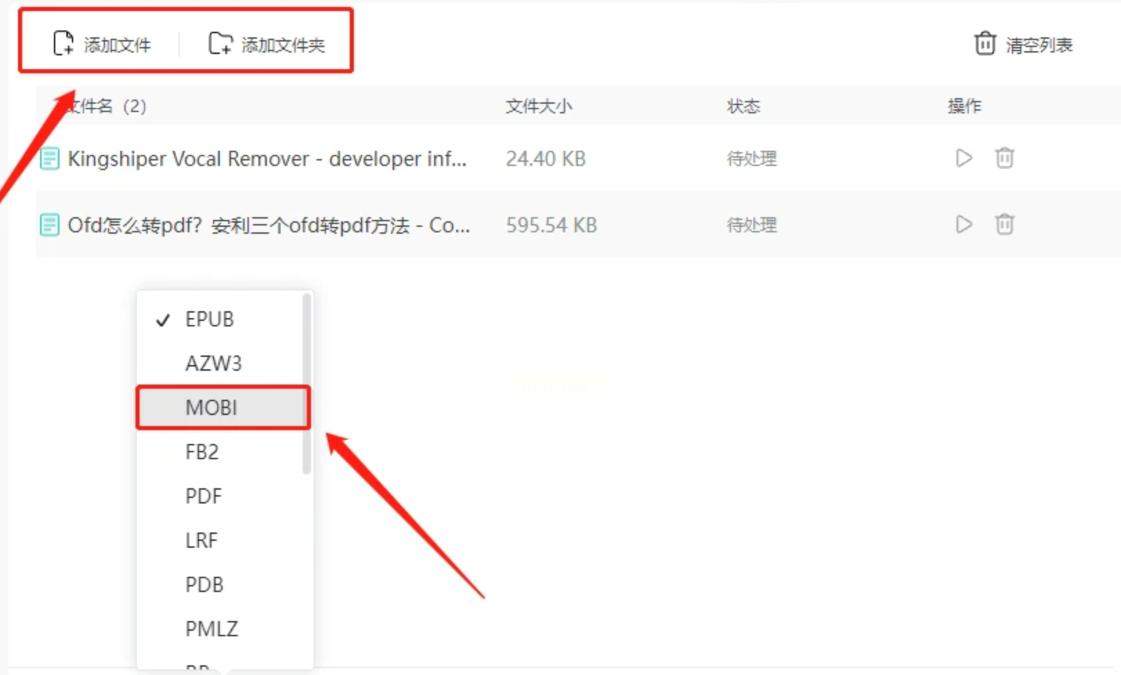 2. 添加文件后选择MOBI格式