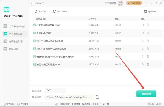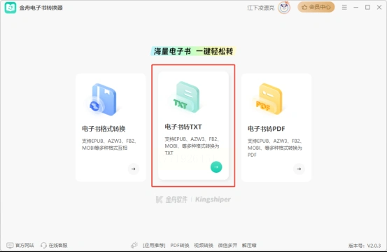 1. 启动功能:点击「电子书转txt」,界面直接显示“epub转txt”选项,操作栏清晰可见。