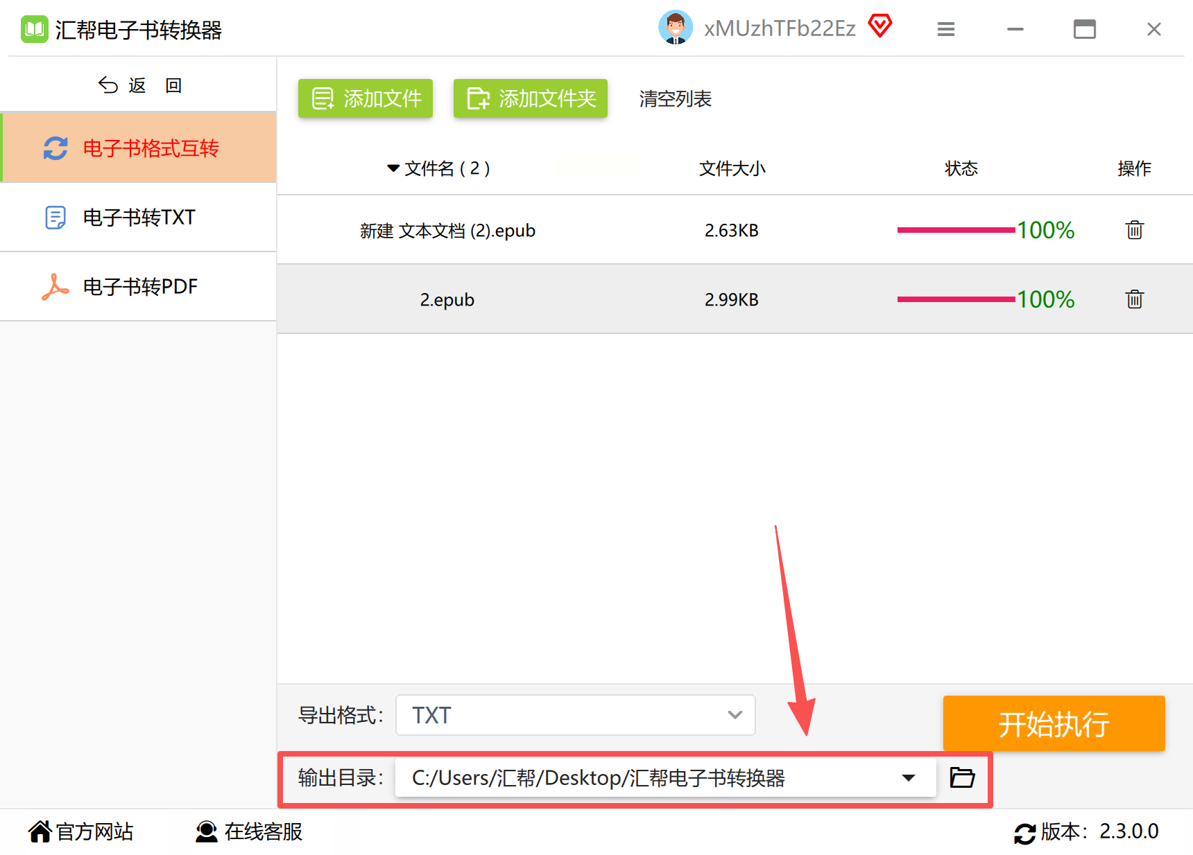 - 输出格式下拉框选「TXT」,软件默认保留原文件章节结构;