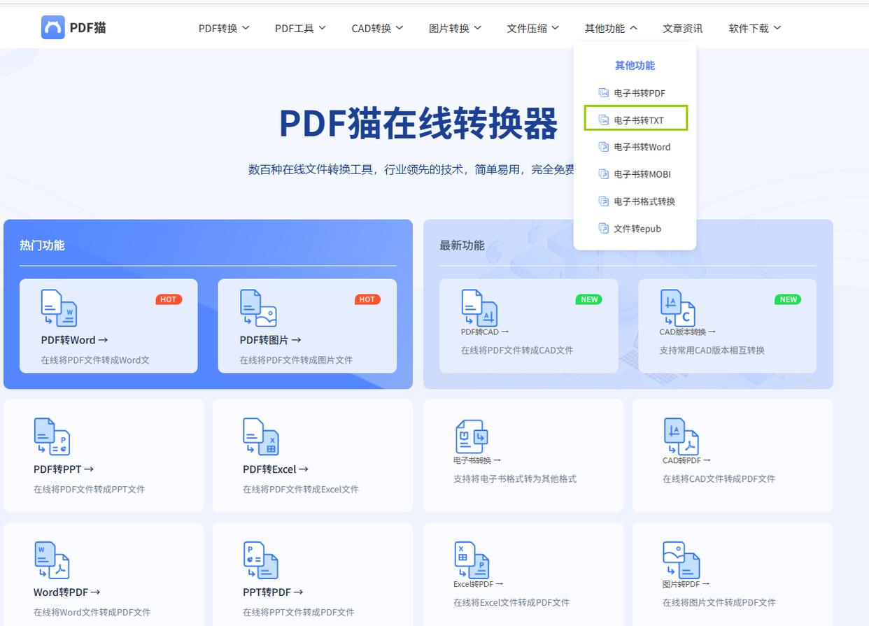 打开pdfmao网站,在功能选项里找到“EPUB转TXT”,点击进入对应的转换界面。
