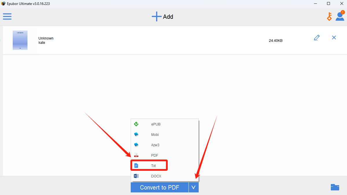 点击“Select File”按钮,从电脑中选择要转换的EPUB文件。然后在格式列表里选择输出格式为“TXT”。