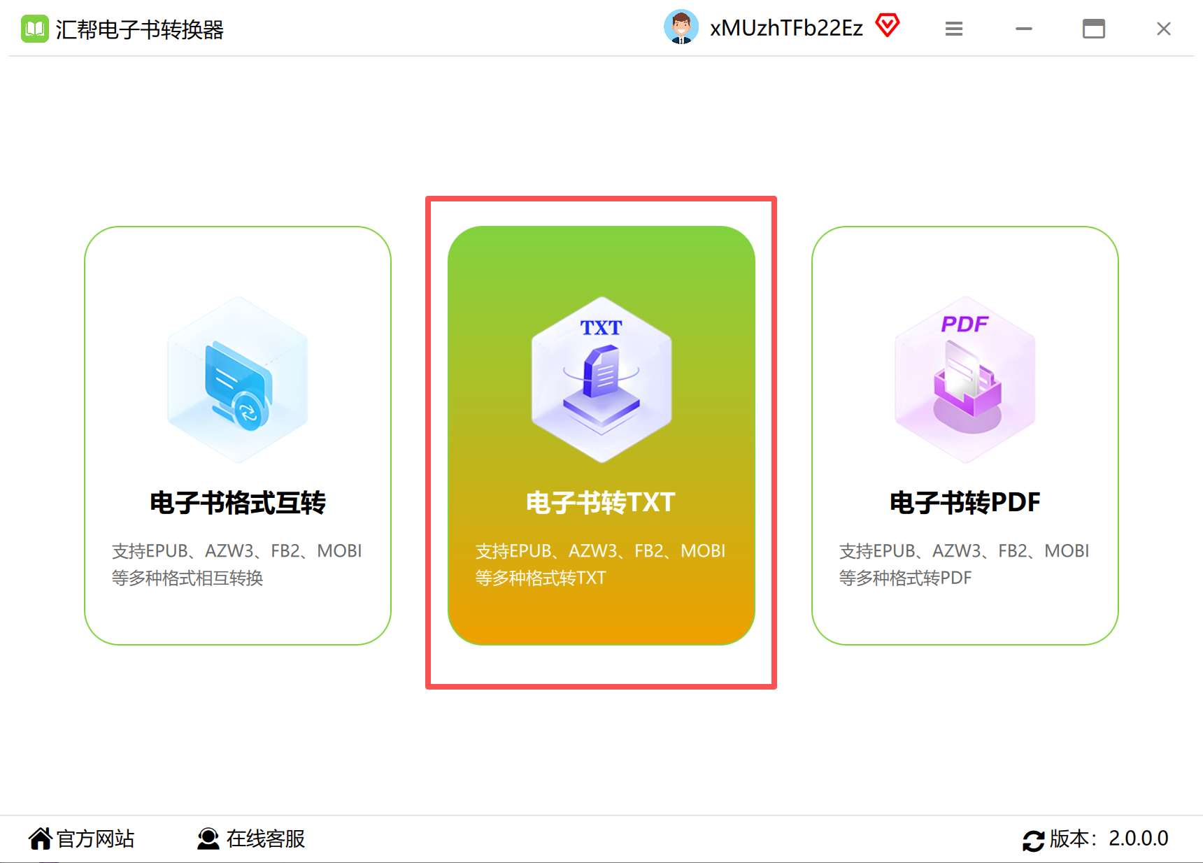 打开软件后首页就看到「电子书转txt」的选项,界面很清爽,连我这种电脑小白都能一眼看懂。
