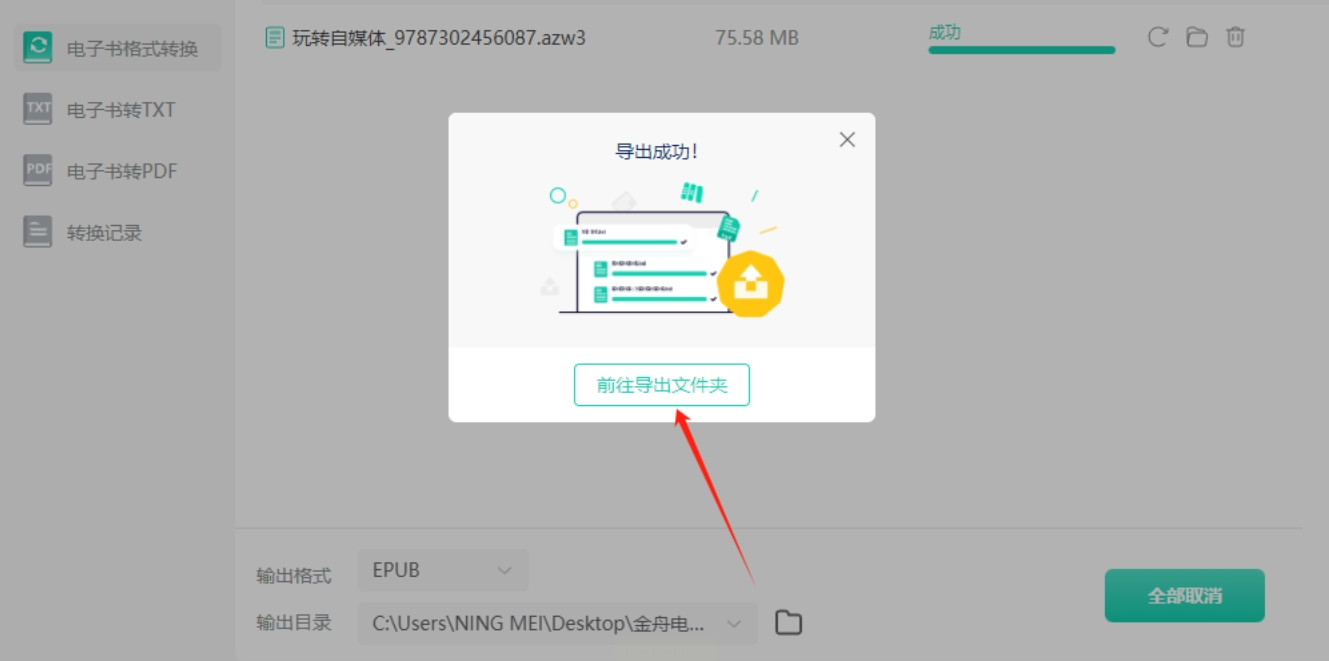 转换完成后,软件会自动弹出输出文件夹,你能看到转换好的epub文件就在里面。如果没自动弹出,去设置里看看输出目录,或者直接在电脑里找到对应的位置。