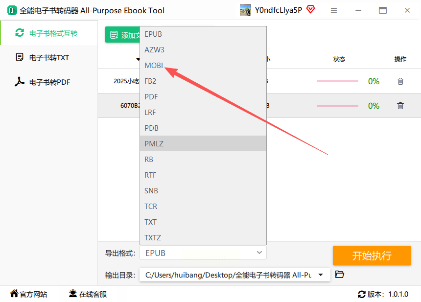 步骤三:在软件下方的输出格式选项中,设置为“MOBI”。