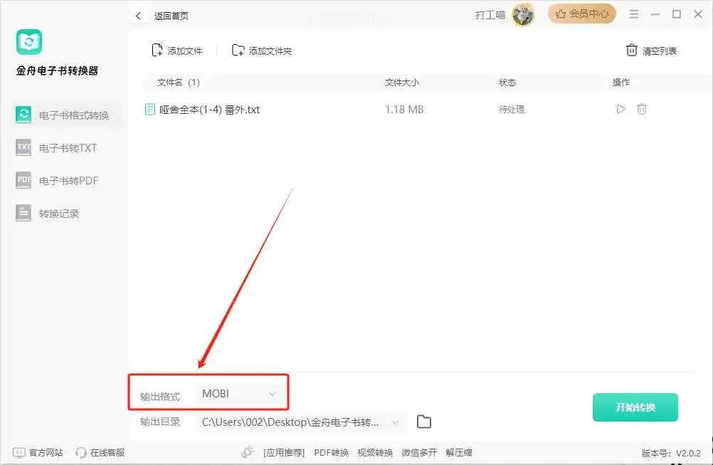 步骤三:文件导进来之后,在软件下方找到输出格式的设置区域。在众多格式选项里,选择“MOBI”。