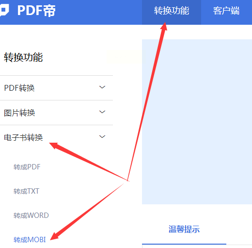步骤二:在页面里,选择“转成MOBI”这个具体功能。网页会刷新出对应的操作区域。