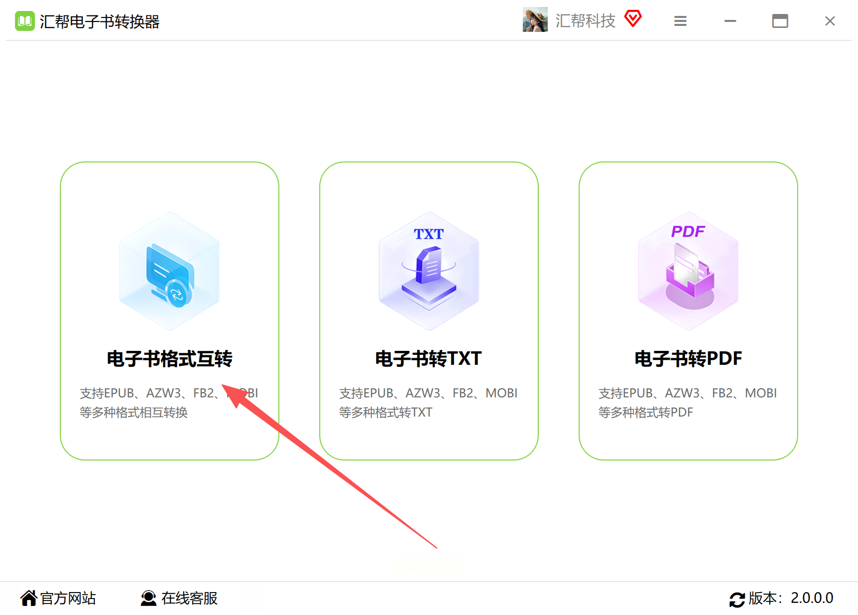 1. 打开软件,找到功能。 安装好后打开“汇帮电子书转换器”,主界面功能一目了然。咱们直接点击【电子书格式互转】这个核心功能。