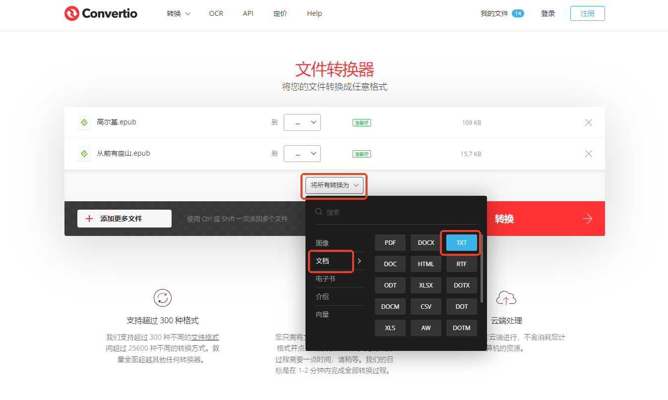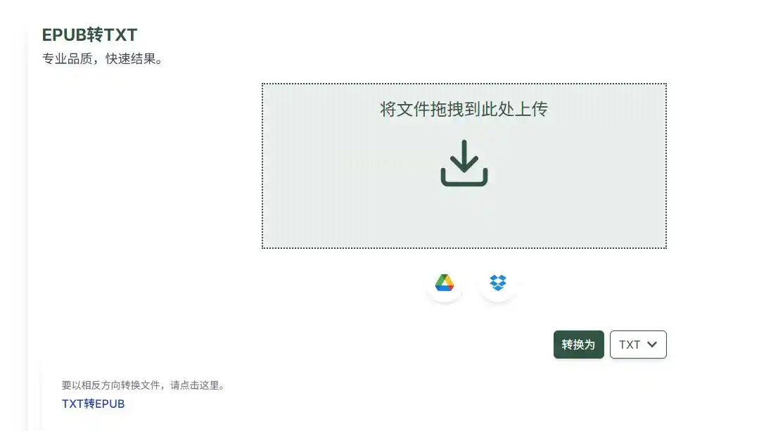 convertio是一个强大的在线文件转换网站,它的触角伸得很广,支持视频、文档、音频、图片等超多格式互转,处理EPUB转TXT自然不在话下。