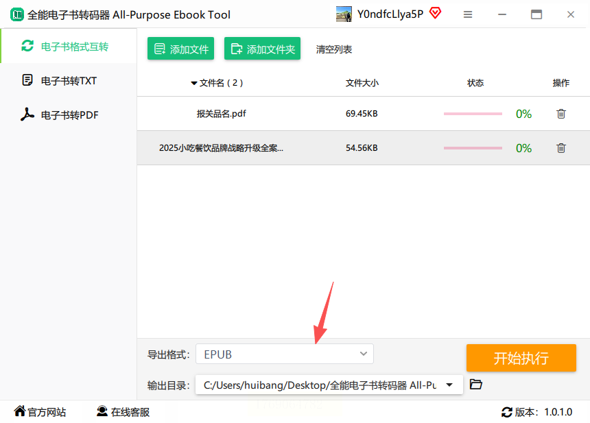 在文件列表下方的格式选项中,找到并选择"EPUB"作为输出格式。这里还提供了MOBI、TXT等其他格式供选择,满足多样化需求。