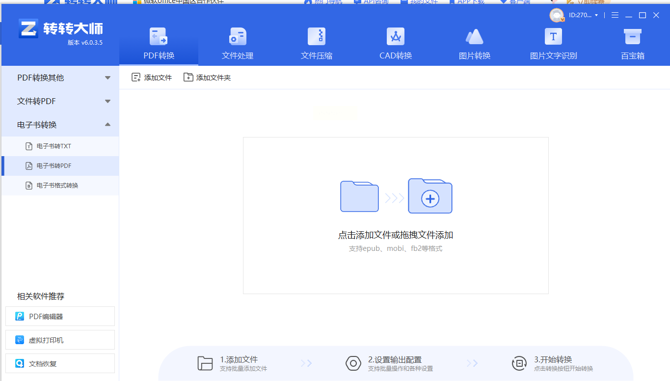 2. 文件导入:左侧栏勾选"电子书互转",点击"添加文件"按钮,支持直接拖拽mobi/epub文件,也可批量添加多个文件(最多支持50个文件同时转换)。