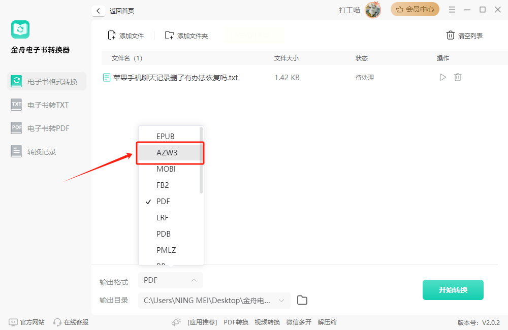 3. 格式选择:在"输出格式"下拉菜单中选择目标格式,若需生成带目录的AZW3文件,可勾选"保留原目录结构"选项。