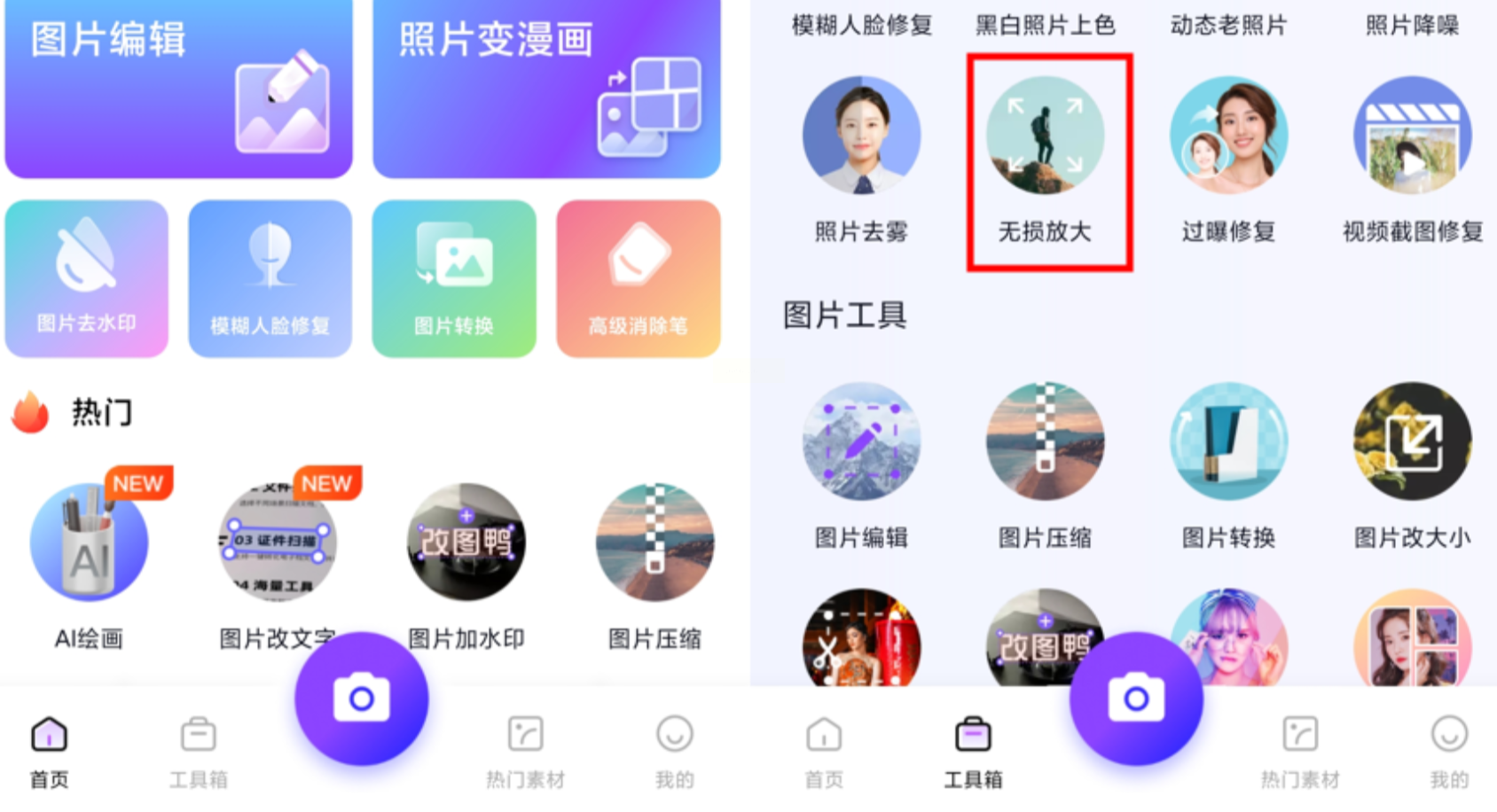 2. 进入功能:首页点击底部导航栏“工具箱”,向下滑动找到“无损放大”功能(位置:工具区中部)。