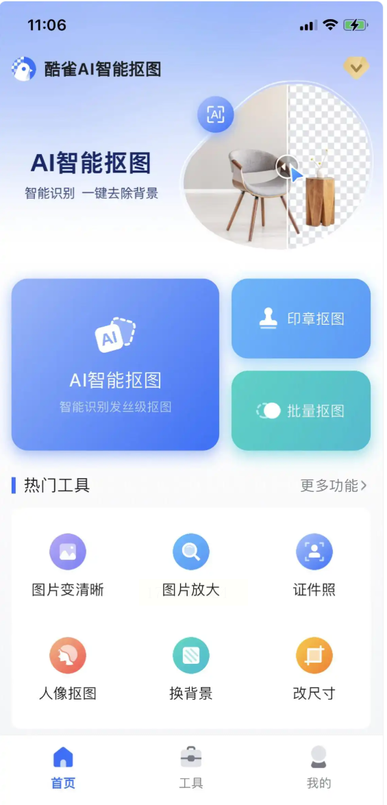 步骤一:启动酷雀AI智能抠图应用,在主页找到“图片无损放大”功能入口。