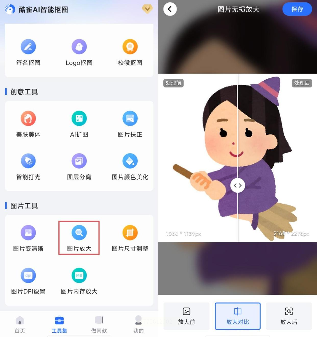 2. 画质提升:放大后文字清晰、边缘无锯齿、细节不丢失,比如产品图放大后能看清面料纹理