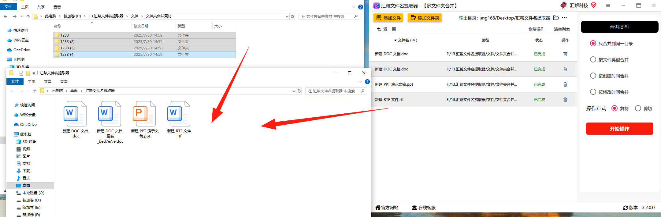 3. 选择合并模式:选「复制」更安全(保留原文件,生成新文件夹),选「剪切」会删除原文件(谨慎用)。