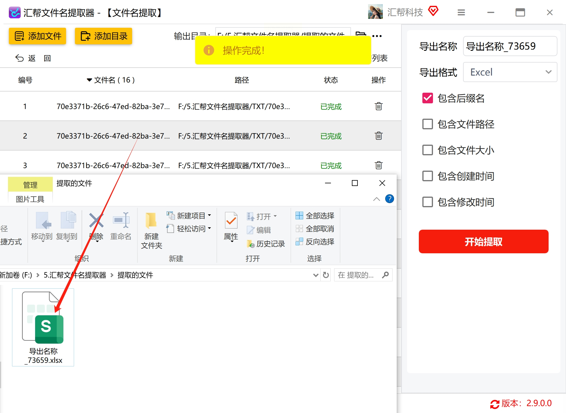 6. 打开Excel看结果:提取完成后会弹出提示,直接打开文件,你会看到Excel表格里整整齐齐列着所有文件名+后缀,复制到其他表格改改格式就能用!