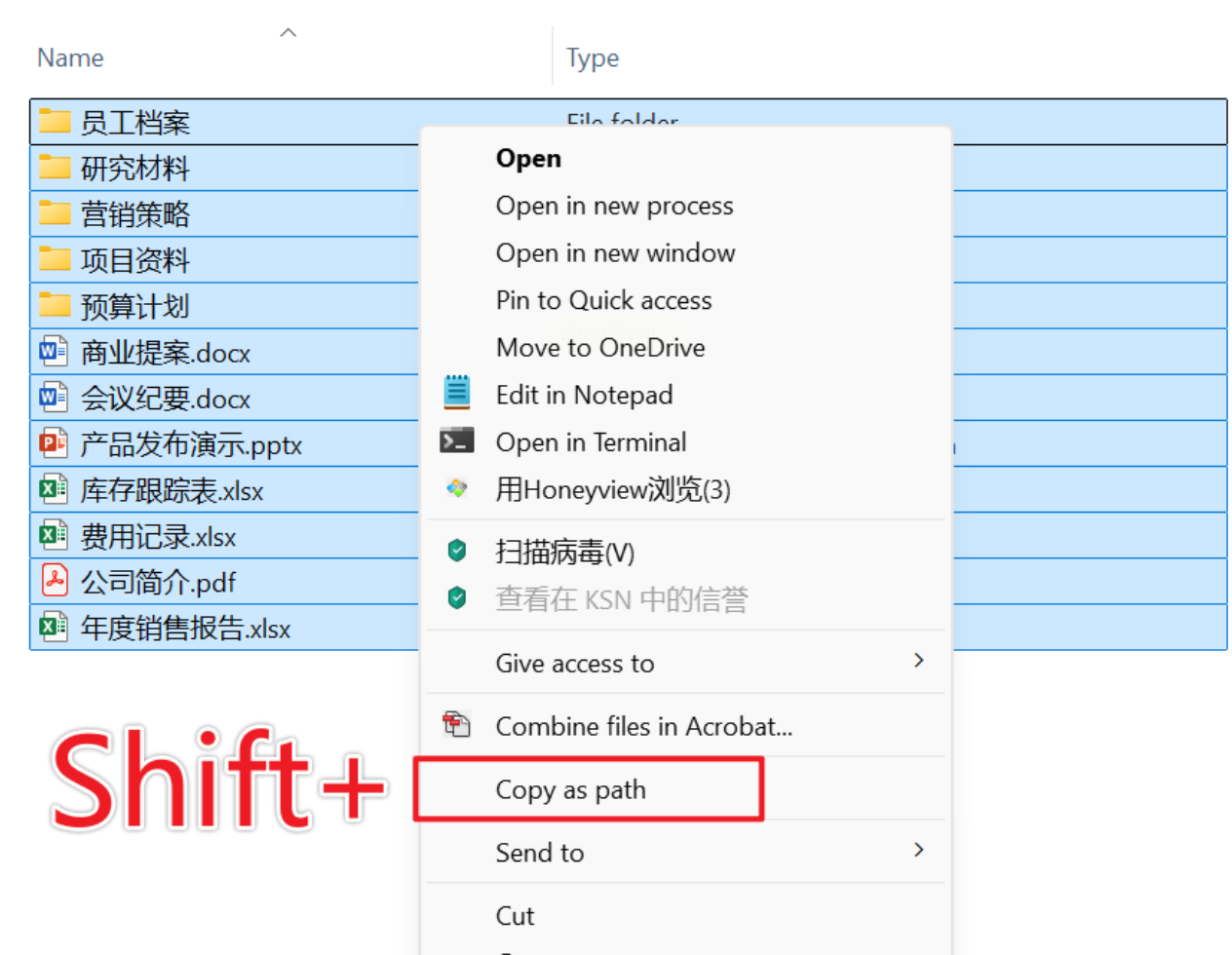 3. Shift+右键,选“复制为路径”:这个功能是隐藏的!按住Shift键,然后右键点击选中的文件,你会发现多了“复制为路径”选项,点击它!