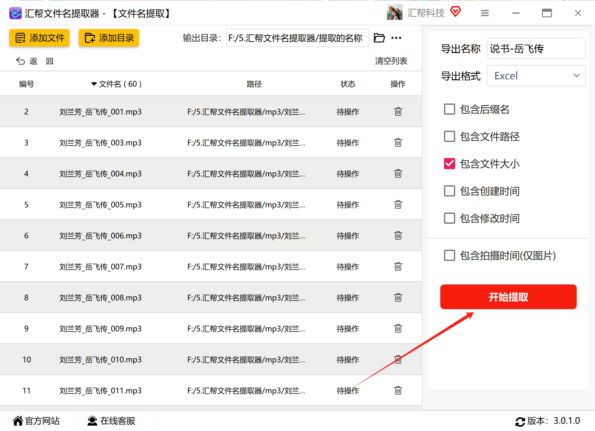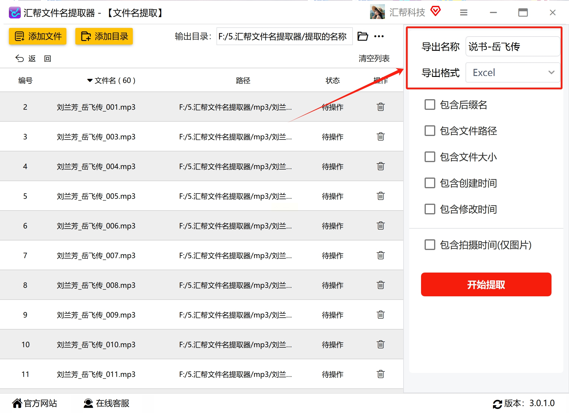 - 输出文件名:可以自定义Excel文件的名称(比如“2023年音频素材清单”),方便后续查找。