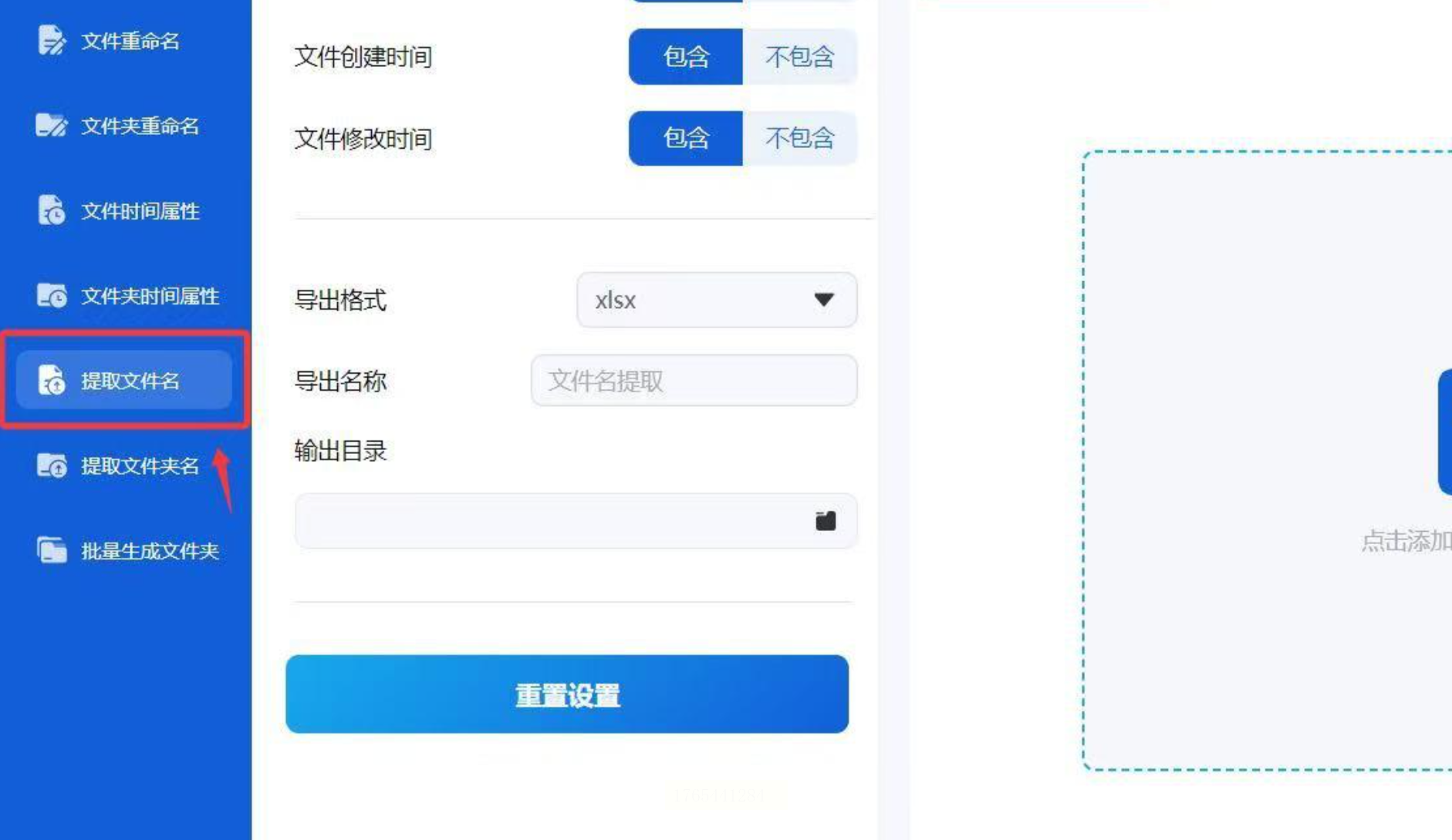 打开软件后,在左侧菜单找到“提取文件名”(和重命名功能并列),点击进入后,右侧会出现“添加文件”按钮。