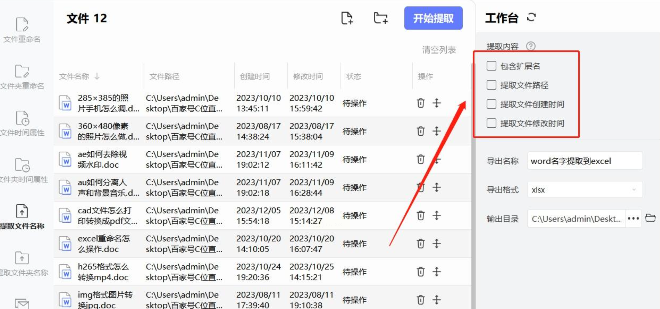 2. 扩展提取内容:在右侧设置栏勾选"提取扩展名"和"提取路径"(如需完整路径可勾选),这些信息会自动添加到提取结果中。