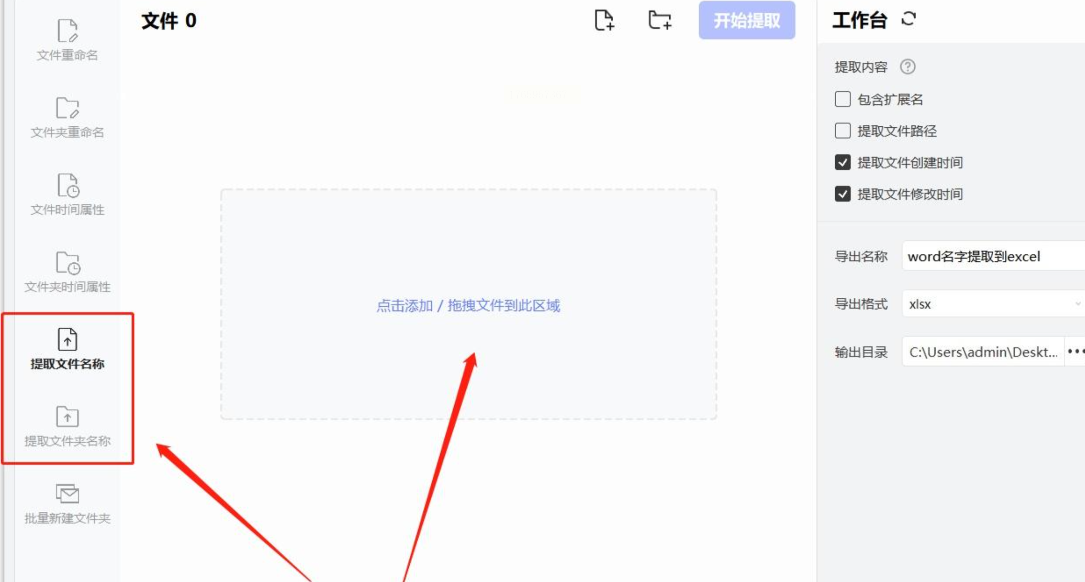 1. 导入文件:打开软件后,在左侧选择"提取文件名"功能,用鼠标直接把文件夹里的文件拖拽到中间的虚线框内(支持批量多选)。