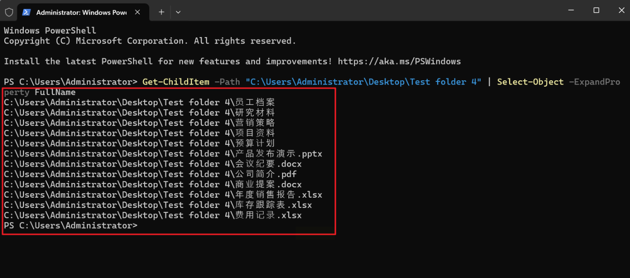 3. 提取所有文件:输入`Get-ChildItem | Select-Object Name, FullName`,回车后会列出所有文件的名称和完整路径。