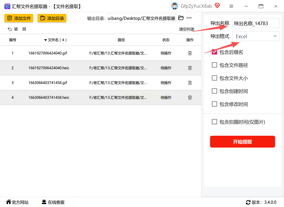 比其他工具多了“包含EXIF信息”选项,能把照片的拍摄时间、分辨率这些也导出来,适合需要额外数据的场景,让提取照片名字到表格的同时,还能保留更多实用信息。