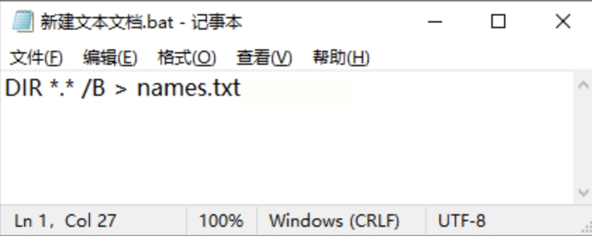 第二步,打开这个新建的文本文档,别怕,里面是空的。你只需要在里面输入一行代码:`DIR *.* /B > names.txt`