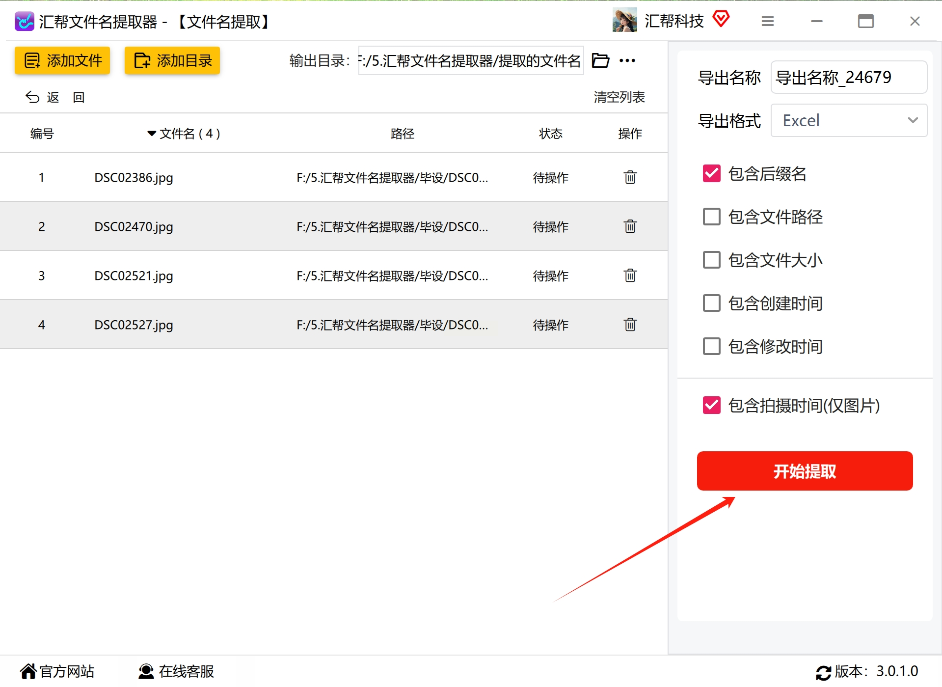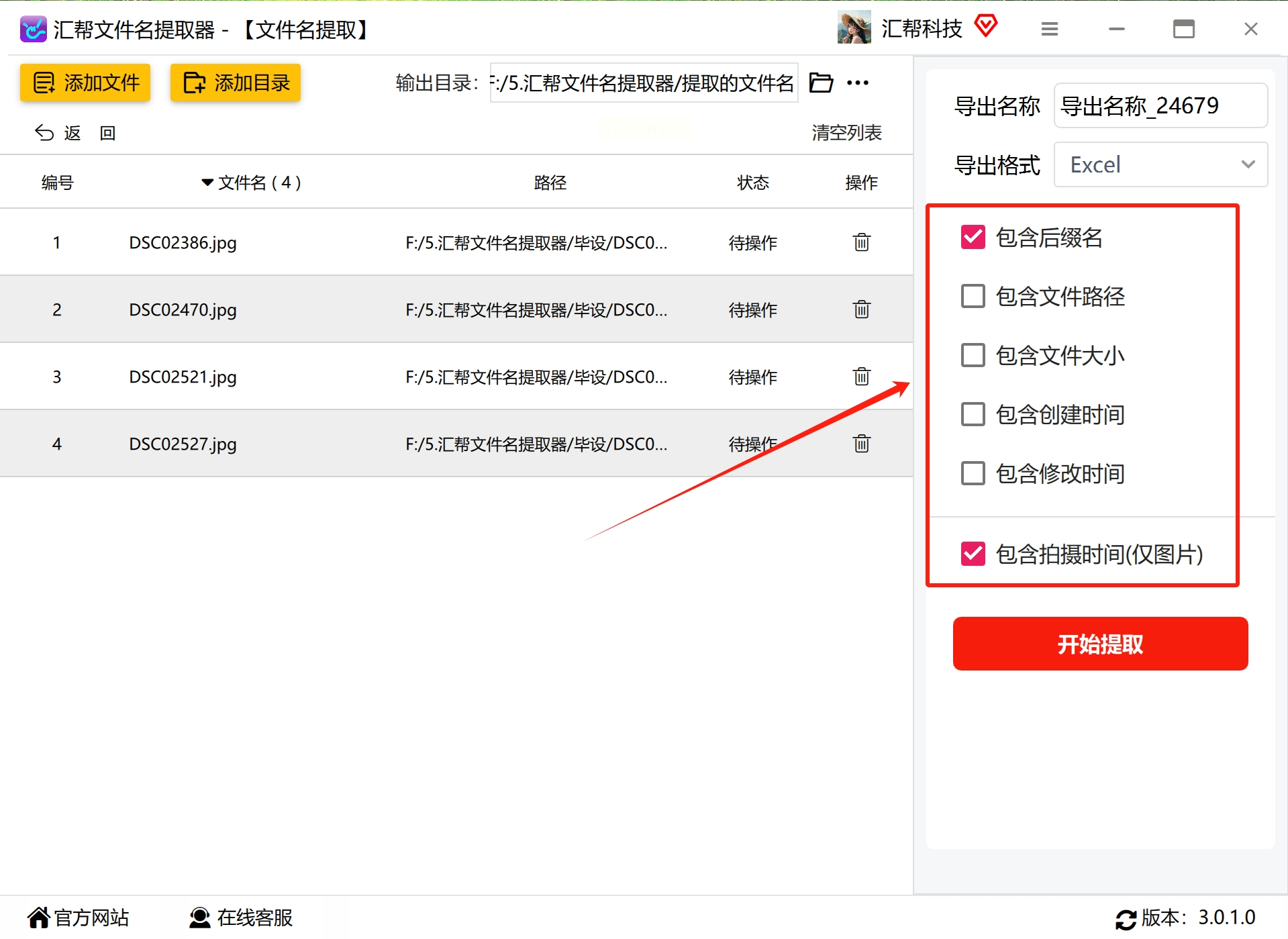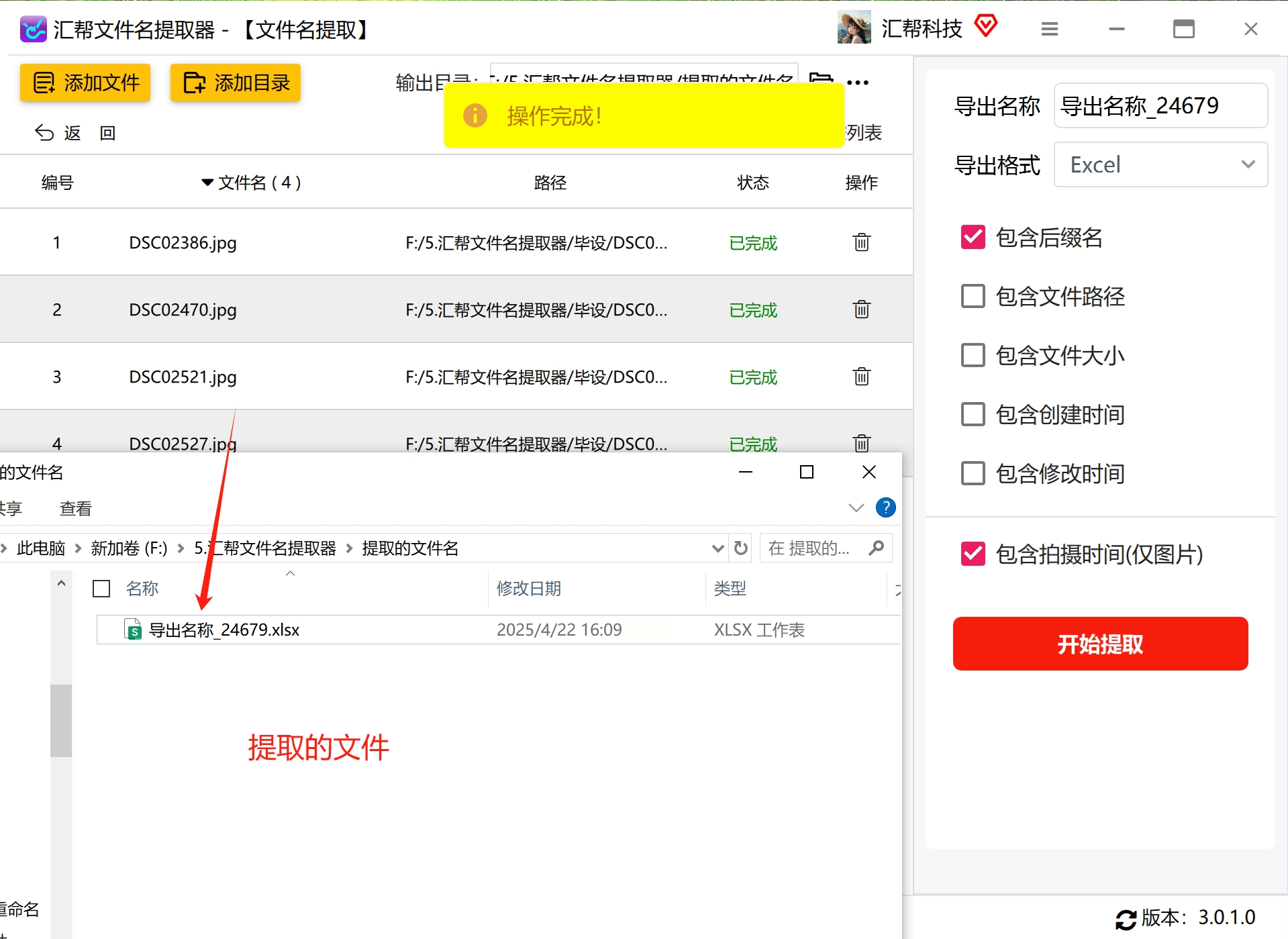 7. 完成所有设置后,点击开始提取按钮。软件将自动读取所选图片的元数据信息,并将指定信息提取出来。