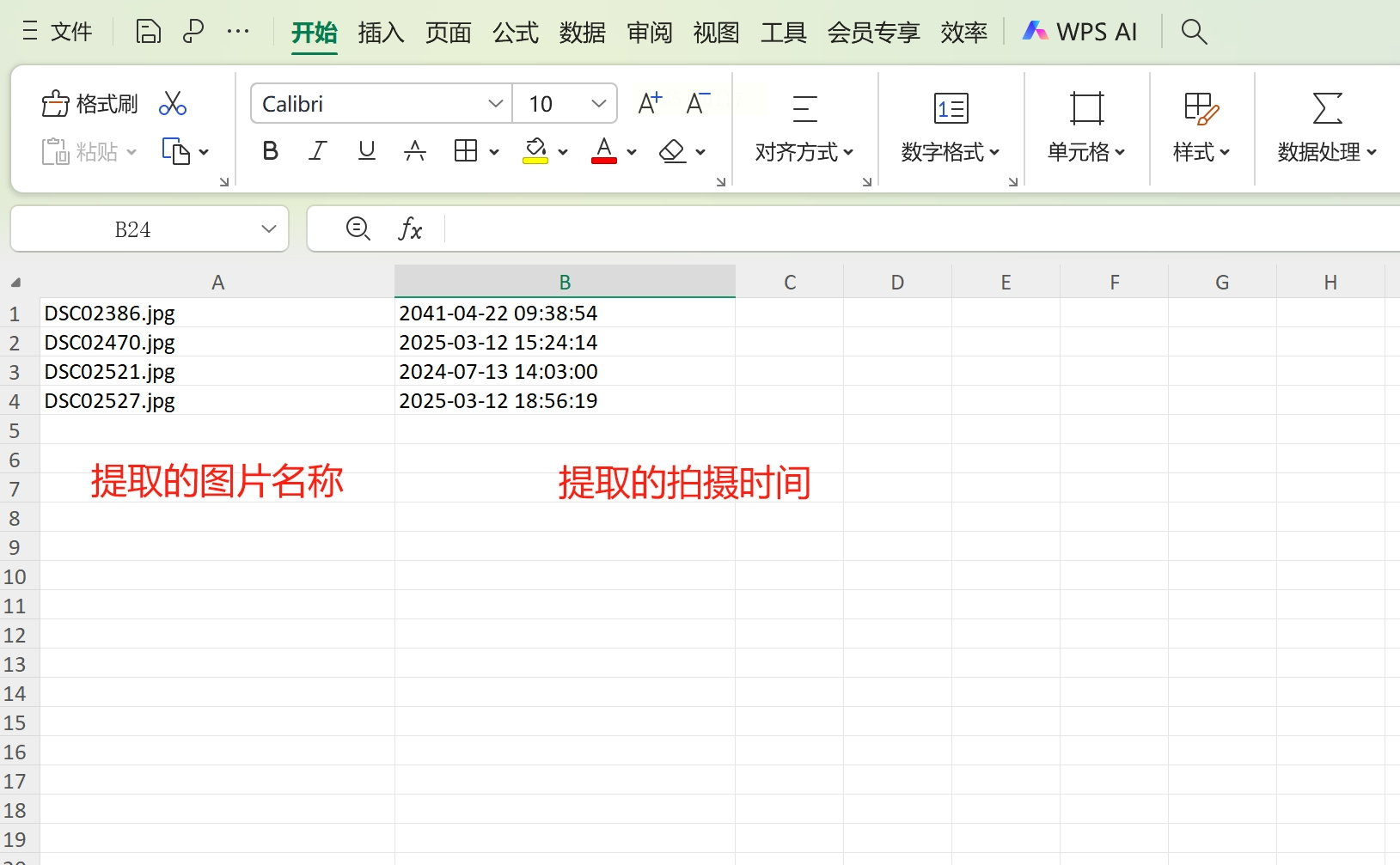 1. 准备一个Excel文件或其他电子表格文件,用于记录提取出的图片信息。建议提前规划好表格结构,例如设置“文件名”和“拍摄时间”两列。
