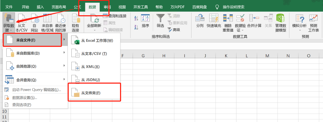 步骤一:打开Excel软件,点击数据选项卡,选择获取数据功能,然后选择从文件中的从文件夹选项。