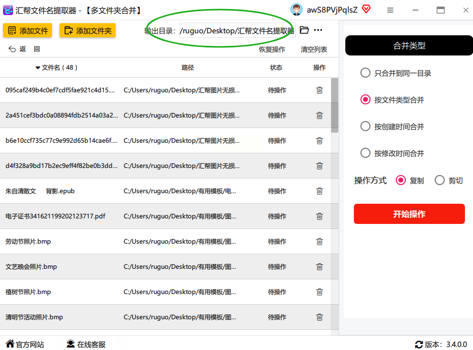 重点来了!一定要选“按文件类型合并”,这样软件才会只识别PNG文件,不会把JPG、PDF之类的也混进来。然后点“开始操作”,软件就会像个勤劳的小蚂蚁,把所有文件夹里的PNG图片都“搬”到你指定的新家了。