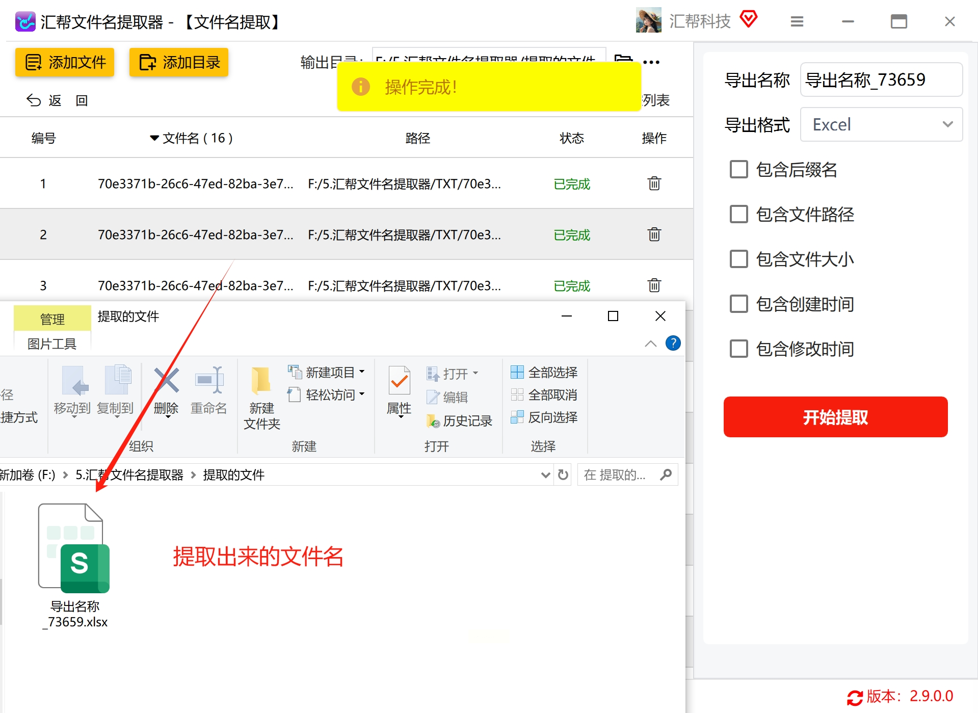 进度条跑完,软件会提示你“操作完成”。这时,按照它提示的路径(通常就是你刚才设置的输出目录),找到那个新鲜的Excel文件,打开它——所有文件名已经整齐地躺在表格里等你检阅了!