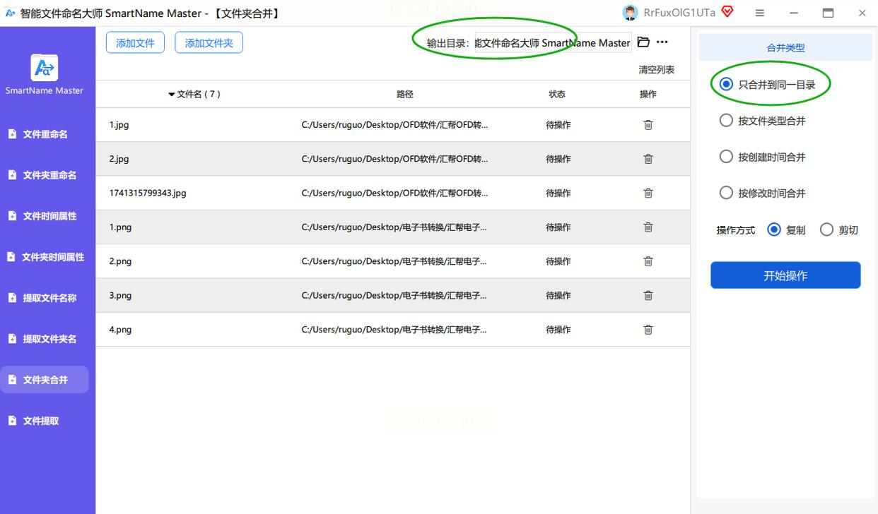 点击“输出目录”,选择目标文件夹(如“桌面-图片汇总”),务必勾选“仅合并至同一目录”,确保图片不会留在原位置。如果需要重命名图片(如按原文件夹名+序号),可在“命名规则”中设置前缀或后缀。