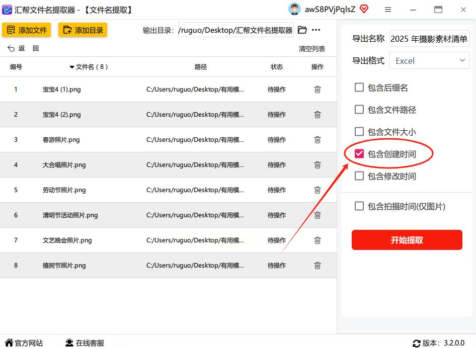 - 想多要信息的话,勾选「包含创建日期」,这样文件名+时间都有了。