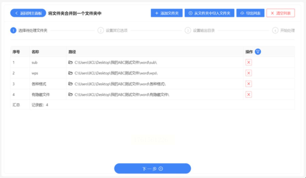 打开软件后,你会看到主界面上有4个主要功能按钮4。今天我们要用的就是第三个——“多文件夹合并”,点击它进入下一步。