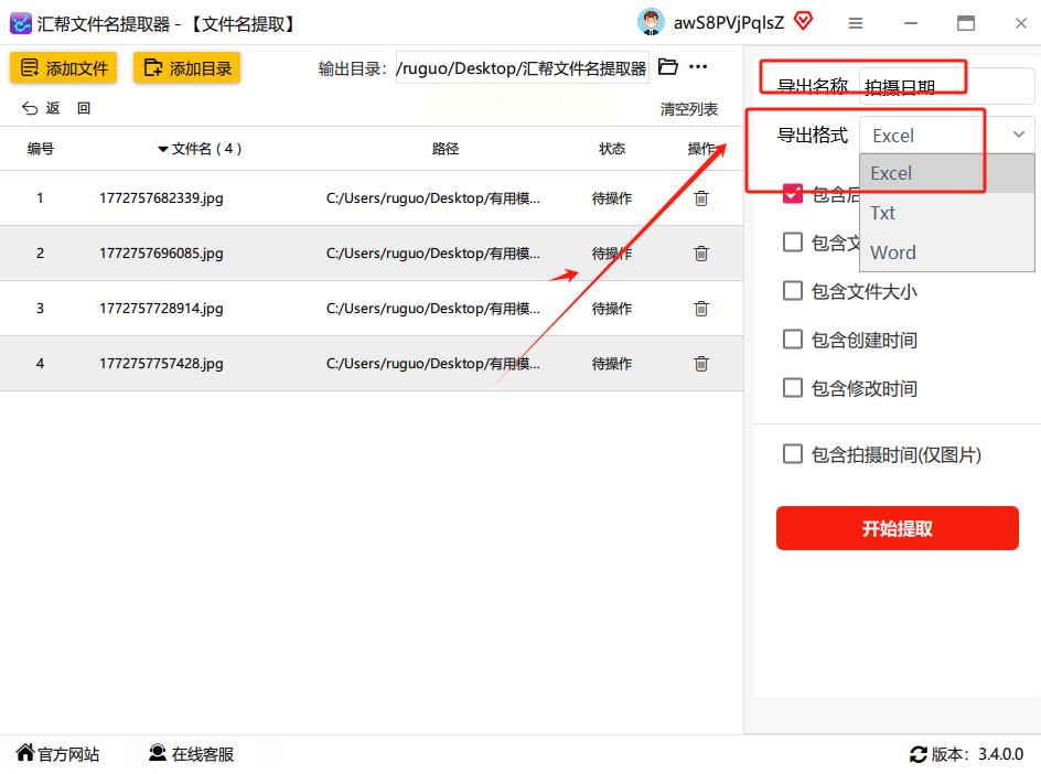 2. 导入照片:打开软件后,点击左侧「文件名提取」模块,选择「添加目录」或直接将照片文件夹拖入软件界面(后者更快捷,支持整文件夹处理)。