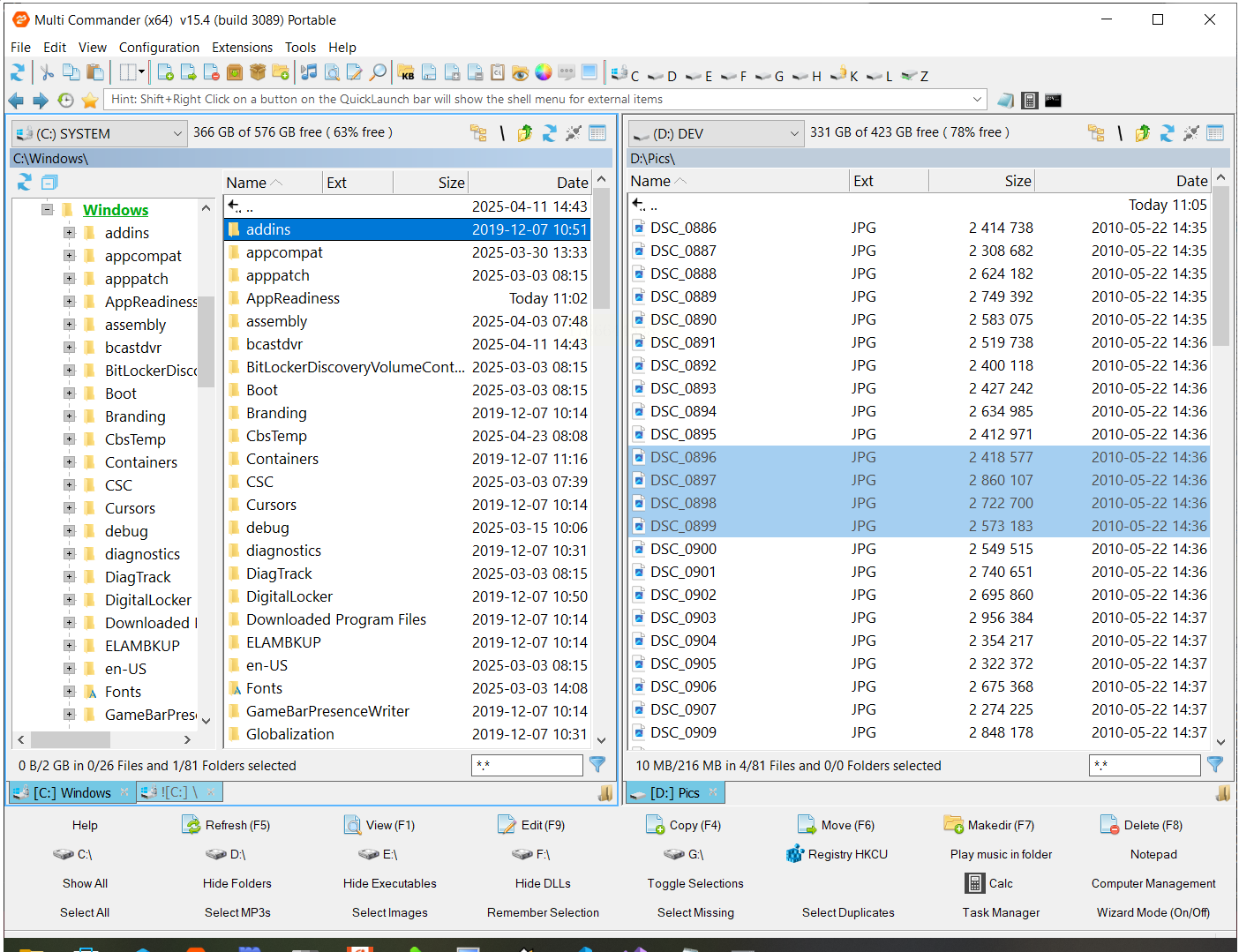 这是一款经典的文件管理软件,资历很老,功能也相当强大。它的界面默认是两个并排的窗口,你可以很方便地在两个不同位置之间对比和移动文件。用它来合并大量文件夹,处理速度很快,不容易卡顿。如果你经常需要和复杂的文件目录打交道,它是个不错的选择。