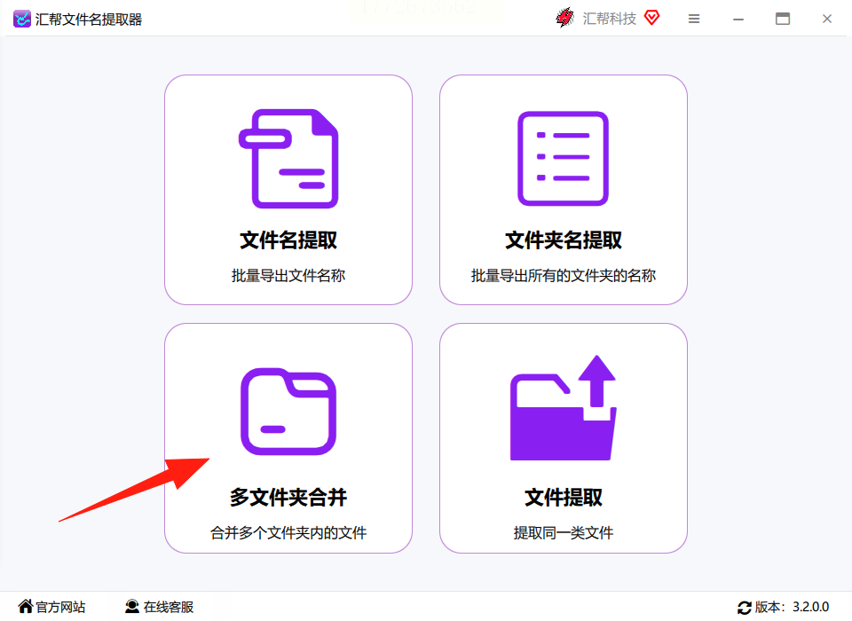 1. 打开汇帮文件名提取器,直接选“多文件夹合并”这个功能;