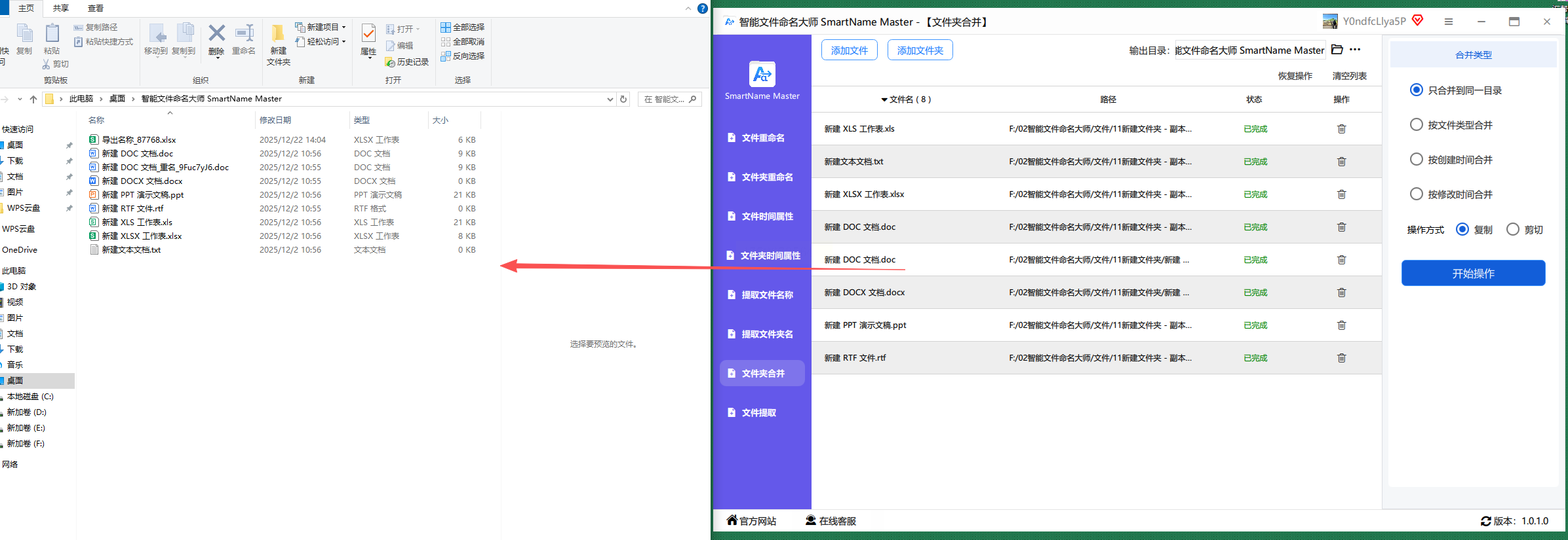 2. 选合并类型(比如合并到同一目录),操作方式选复制(备份源文件)或剪切(源文件会删除);