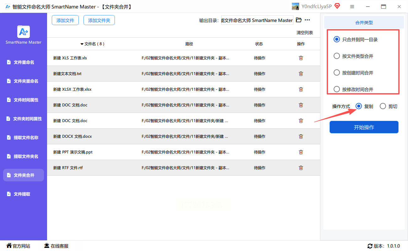 3. 操作方式选“复制”更保险,因为复制会备份源文件,剪切的话源文件会被替换,选完点开始操作;