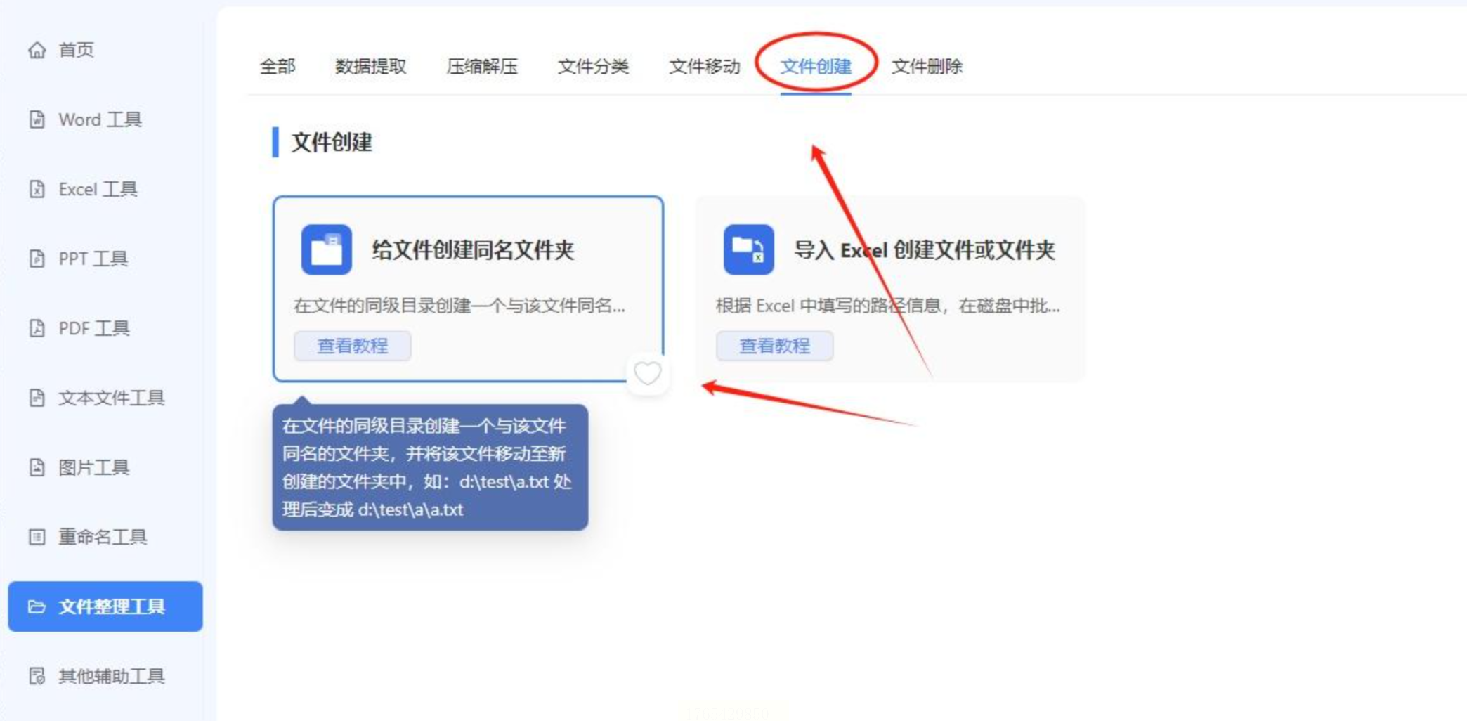 打开“鹰速批量处理工具箱”,在左侧菜单找到“文件整理工具”分类,点击进入后选择“给文件创建同名文件夹”功能。