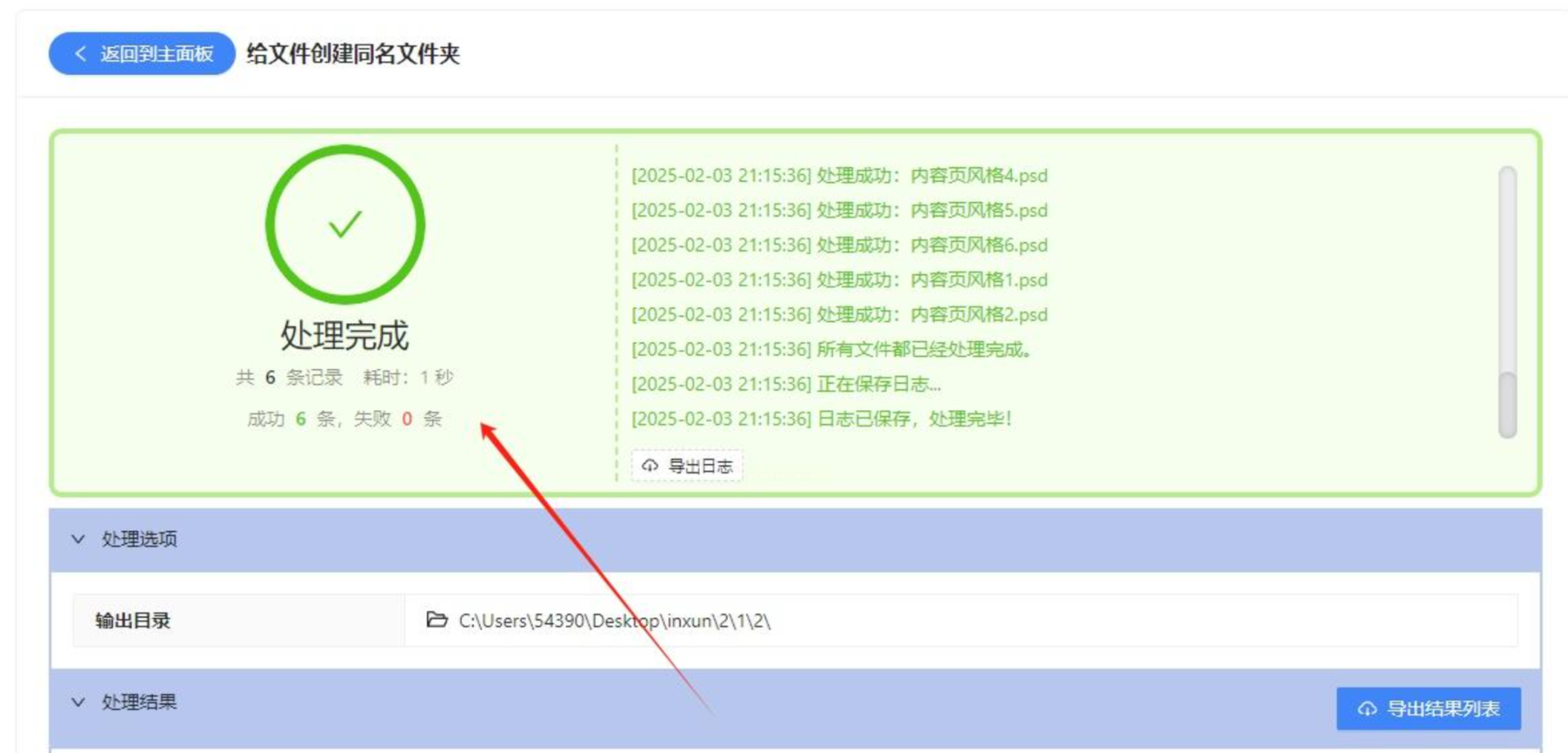 点击“开始提取”后,软件会自动完成文件分类。完成后会弹出“操作成功”提示,此时可在输出目录中查看整理好的文件夹及对应文件。
