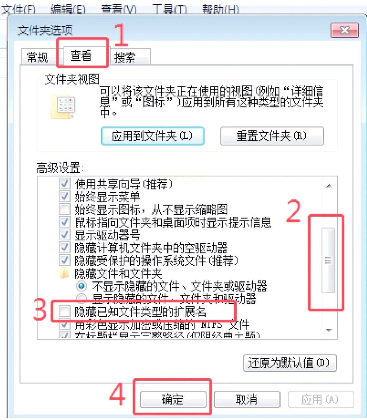 1. 显示文件后缀名:先把隐藏的文件后缀显示出来!打开任意文件夹,点左上角"工具"→"文件夹选项"→"查看",找到"隐藏已知文件类型的扩展名",把勾去掉,点确定。