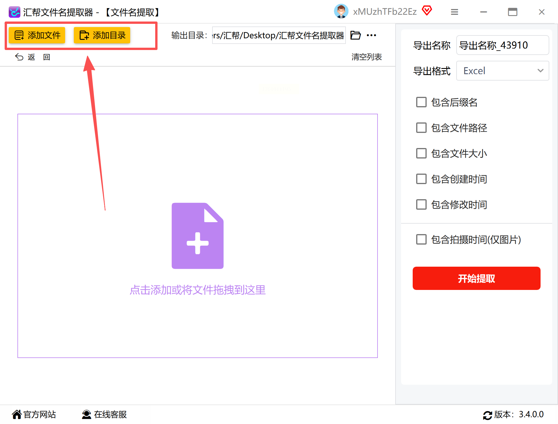 步骤二:根据文件数量选择添加方式。处理少量文件时,点击“添加文件”;如需提取整个文件夹的文件名,则选择“添加目录”。