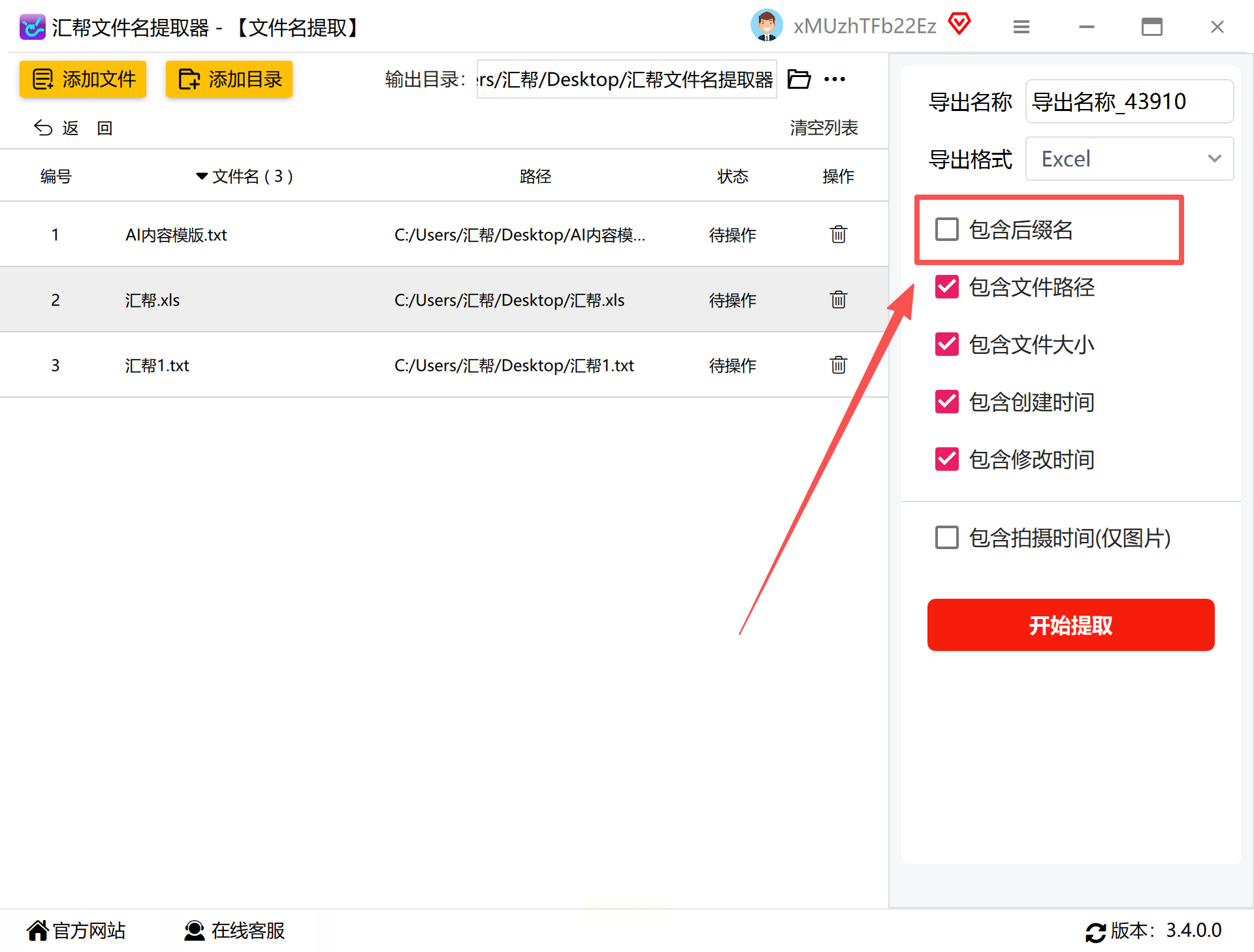 步骤五:在属性设置中,取消勾选“包含后缀名”选项,确保导出的文件名不包含扩展名。