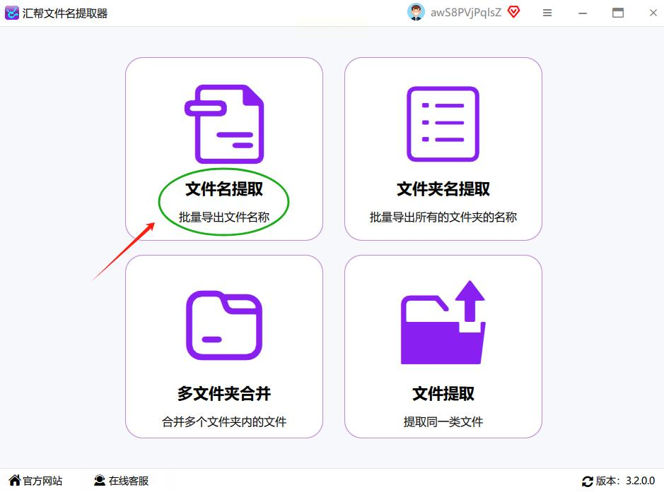 直接打开汇帮文件名提取器,界面很清爽,一眼就能看到「文件名提取」这个选项,点它就对了!