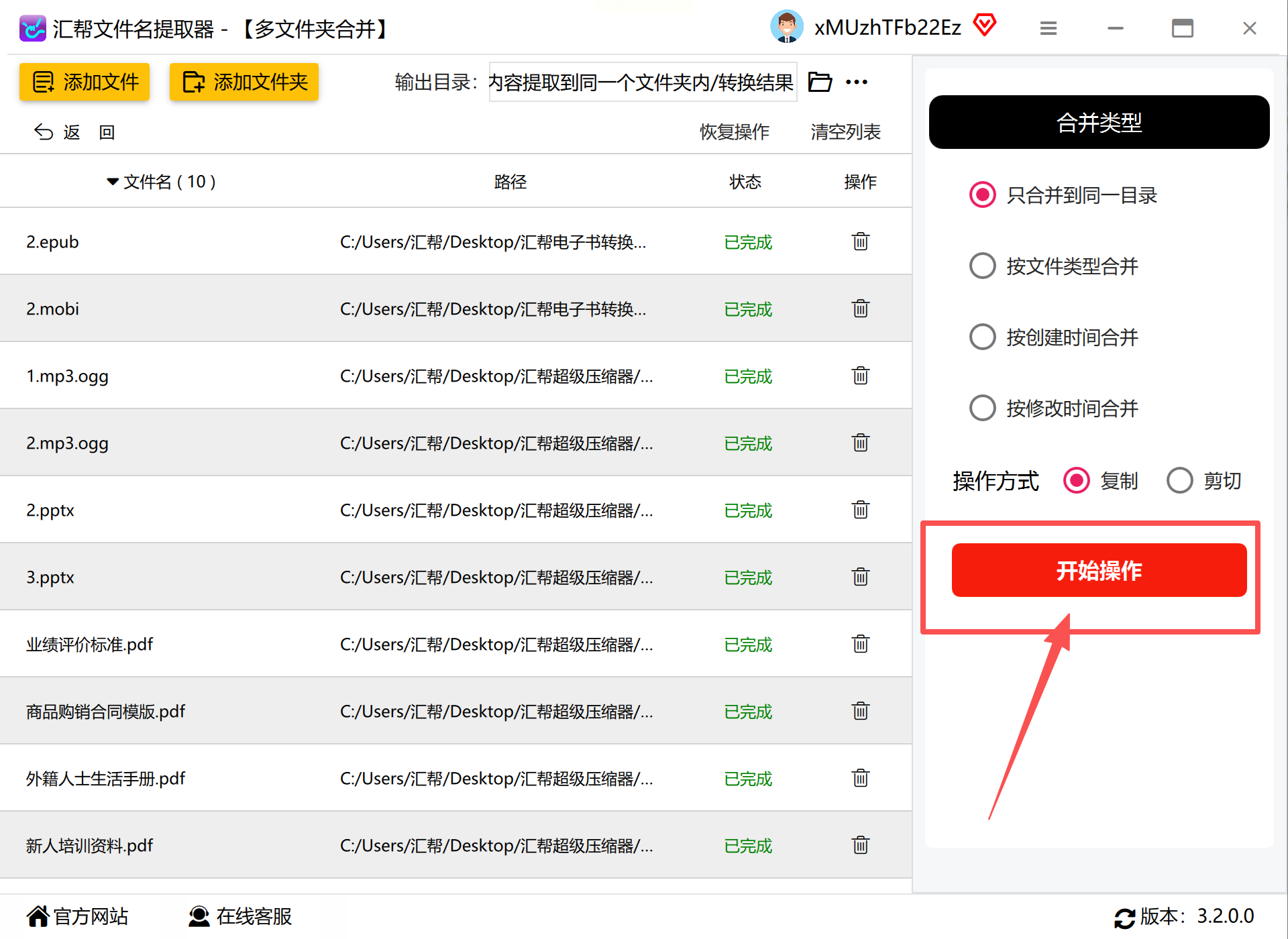 - 步骤四:点击“开始合并”,进度条显示文件处理状态,完成后可在左侧“结果”栏查看合并后的文件列表。